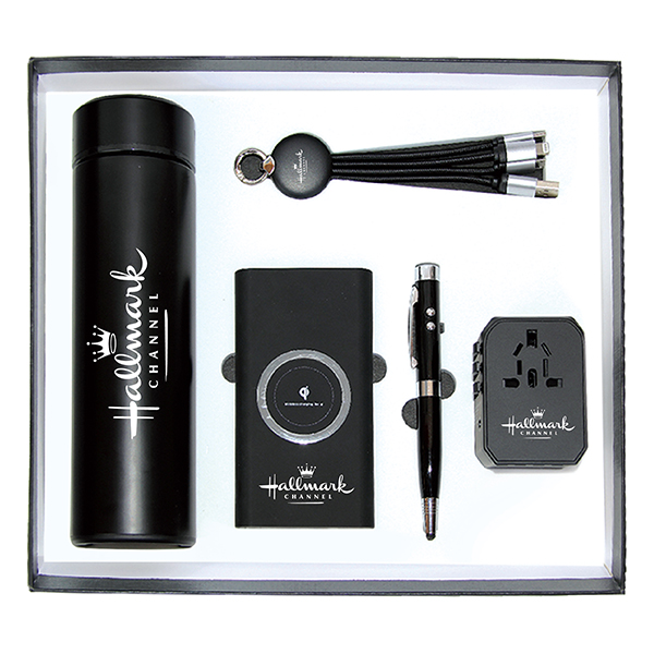 PROMOTIONAL GIFT SETS ATM-13 : Stainless Steel Drinkware A-061 : Wireless Powerbank (10000 mAh) AF-065 : Laser Light USB Flash Pen Drive ACB-11: Logo Light Up Cable 3 in 1 USB Charging Cable AD-11: Light Up Logo Universal Travel Adapter Packing Top Box Size : 29.8x 28.5 x 10.1 cm