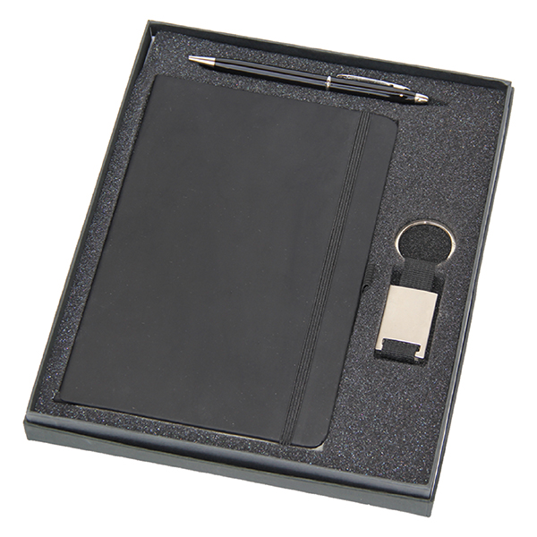 PROMOTIONAL GIFT SETS AN-01: A5 Size PU Notebook Black AKE-07: Metal Keychain with Fabric Strap AMP-025 : Slim Metal Ball Pen Twist Packing Top Box Gift Size : 28 x 24.5 x 2.8 cm