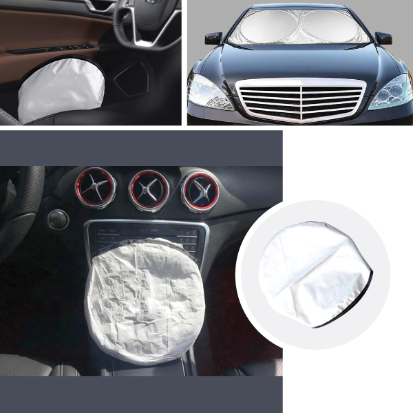 CAR SUNSHADE Material : Nylon, Silver with black boarder Flat Size : 150 x 70cm | Circle Diameter : 61cm / 24″ Printing Option: Screen Printing